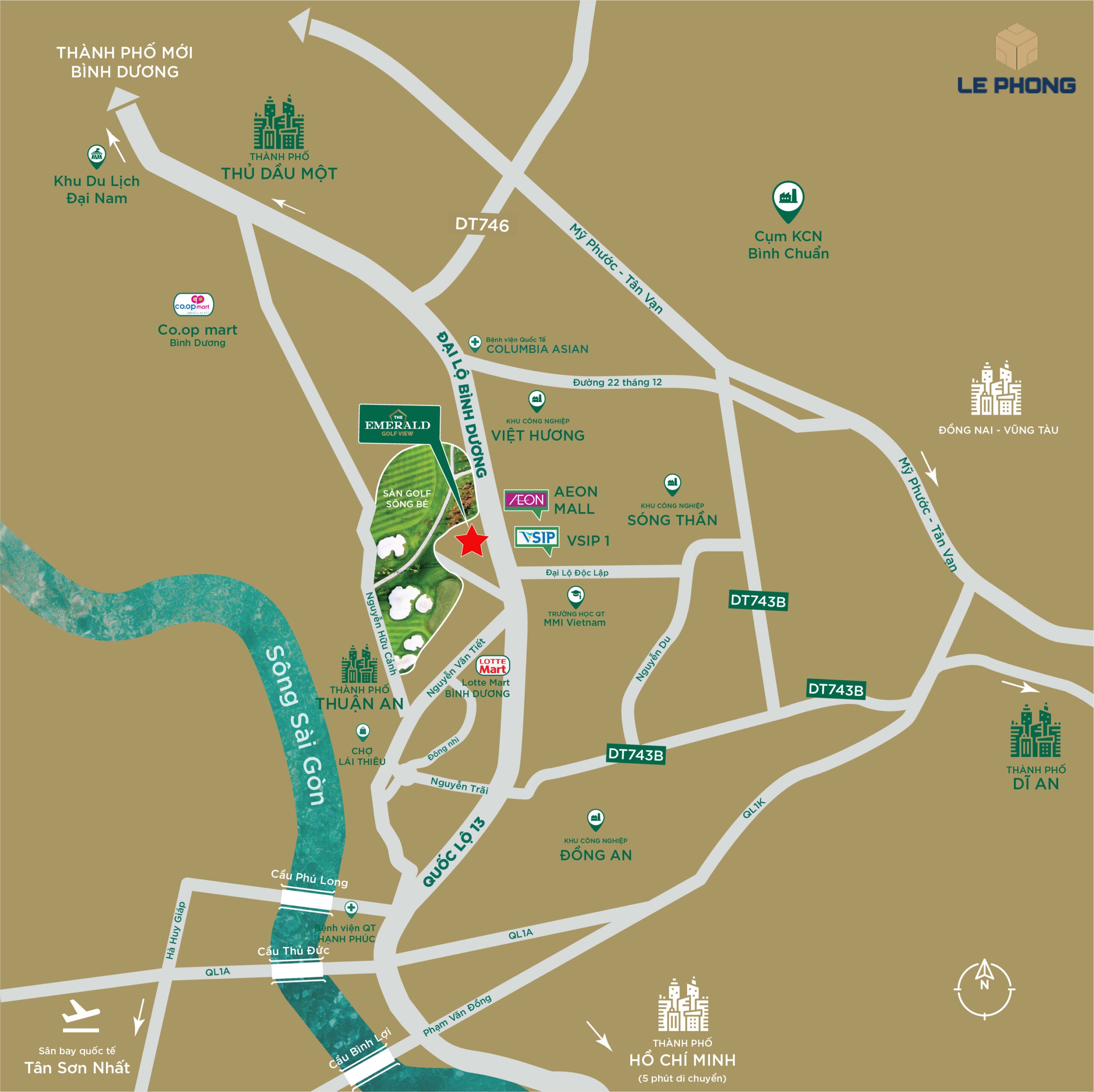 The Emerald Golf View nằm mặt tiền Quốc lộ 13, kết nối nhanh các tuyến giao thông và hạ tầng trọng điểm, gần cụm công nghiệp – thương mại lớn, tiềm năng tăng giá cao. Tuyến Metro số 2 ngay trước dự án mang đến nhịp sống hiện đại và thuận tiện cho cư dân.