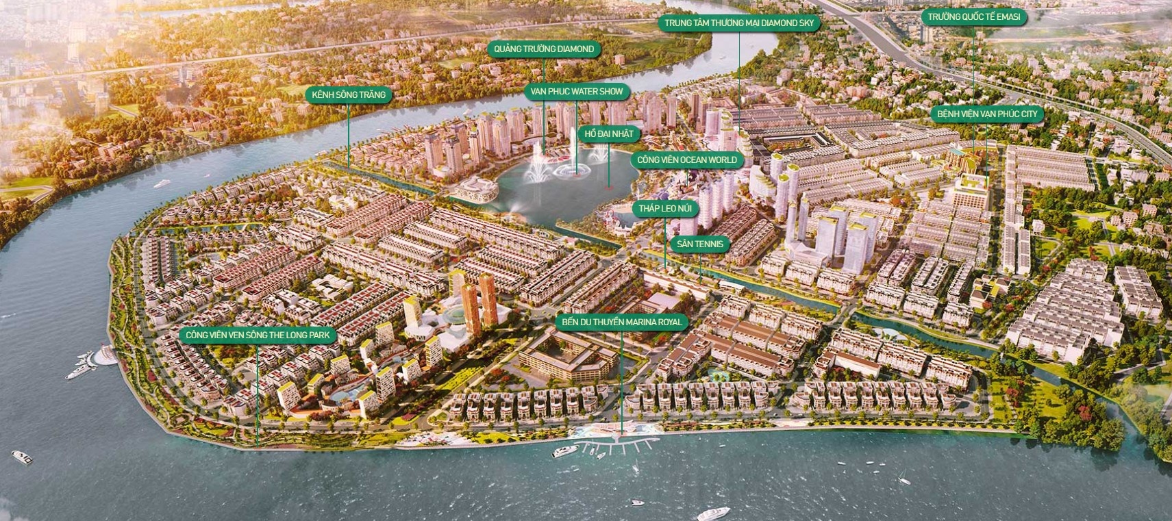 Quy hoạch gồm 25 tòa tháp căn hộ cao tầng với khoảng 10.000 căn, kết hợp hơn 1.800 sản phẩm thấp tầng như nhà phố SOHO, shophouse và villa ven kênh. Tổng thể dự án được thiết kế hiện đại, đồng bộ, tối ưu không gian sống và giá trị khai thác.
